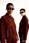 Jacket features Chinese hanfu inspired silhouette with detachable and retractable red panel system. Asymmet...