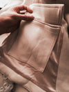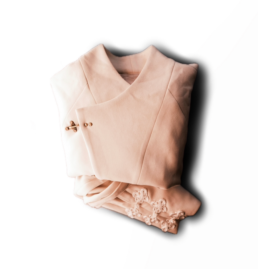 Jacket features Chinese Hanfu inspired silhouette with detachable and retractable beige panel system. Asymmetric front closure with copper finished metal buckles and faux suede fabric to complete the piece. Conceived for all-season versatility, each element has been meticulously chosen to embody quiet luxury and endure form. A testament of our craftsmanship, and the art of elevated essentials.